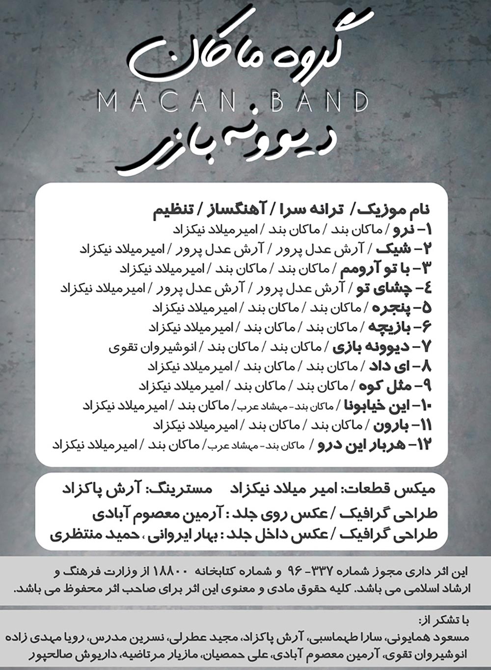 گفتنی است مراسم جشن امضای آلبوم” دیوونه بازی” ماکان بند روز جمعه از ساعت ۱۸ الی ۲۱، در فضای باز برج میلاد برگزار می شود.